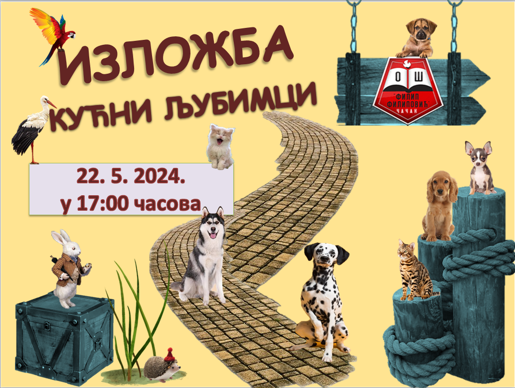 Ученици млађихразреда наше школе у среду, 22. маја учествовали су у изложби кућних љубимаца! Око седамдесет животињица, чији су власници наши ученици, чинили су пси, мачке, канаринци, корњаче, морско прасе, папагаји, рибице, кокошка, певац и многе друге животиње! Организатор манифестације била је ОШ ,,Филип Филиповић". Сви учесници су добили захвалнице од школе и медаље Кинолошког удружења ,,Драган Радовић Џони"!