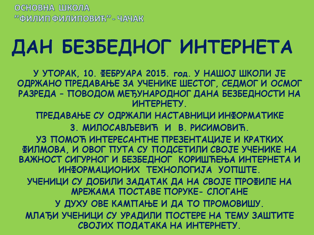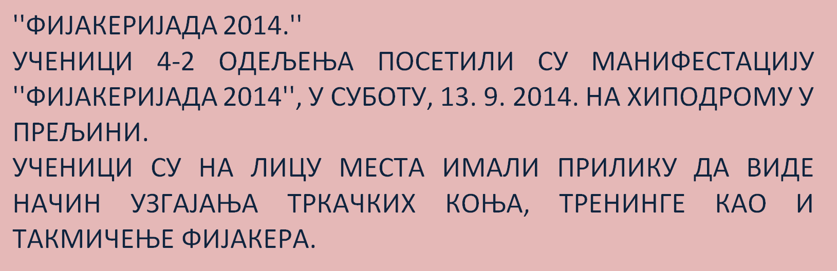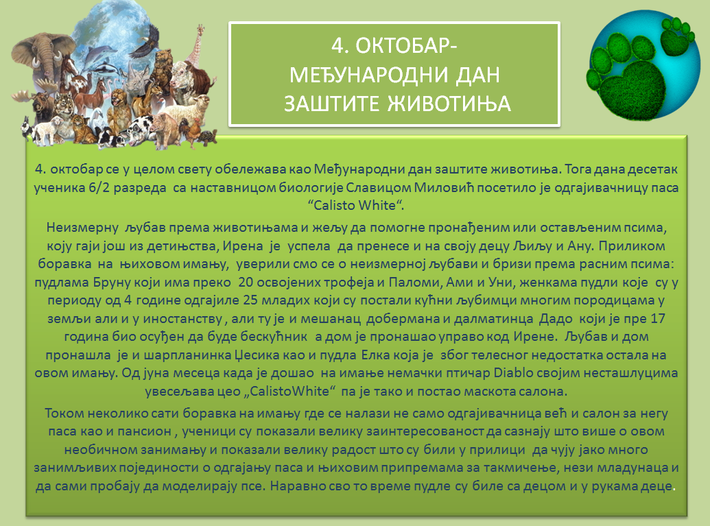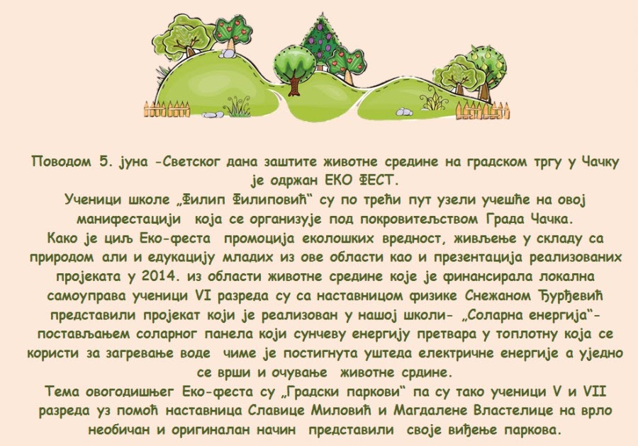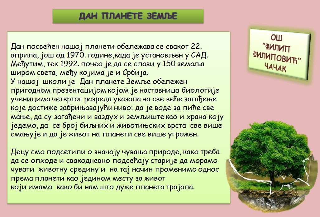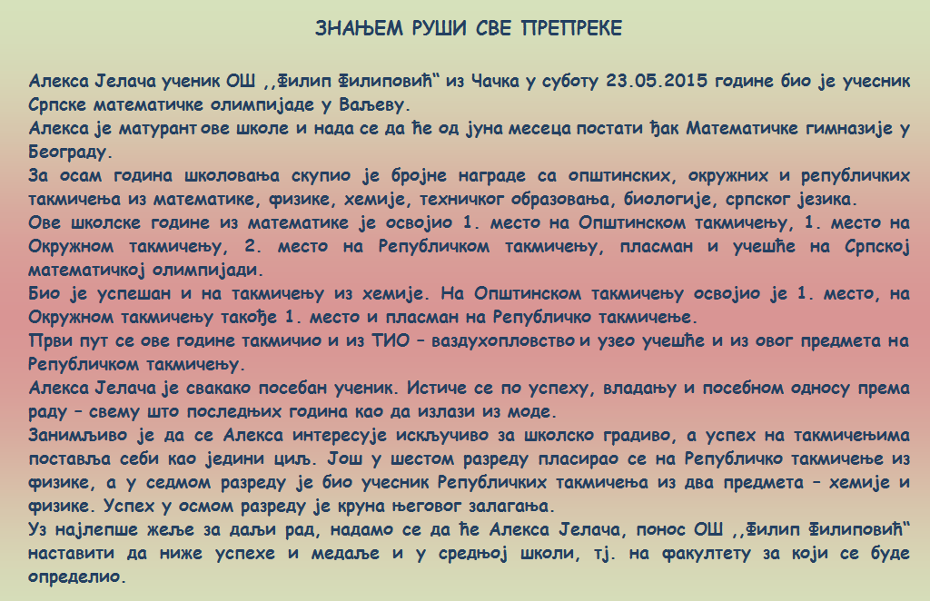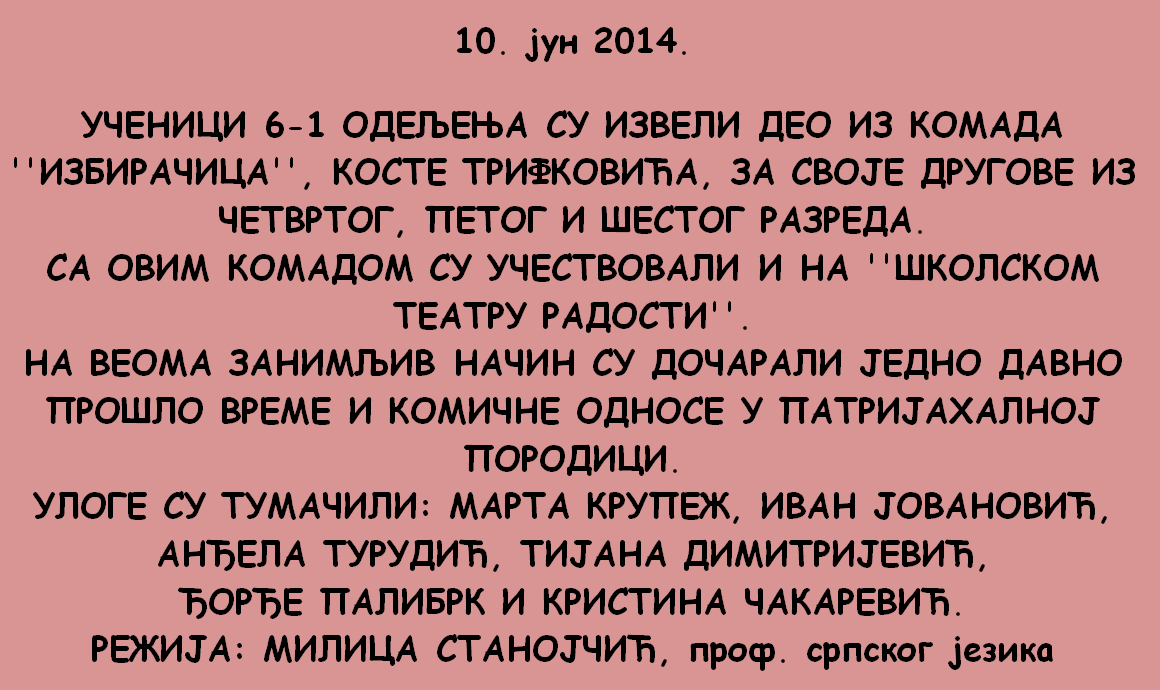 У програму су учествовали ученици од петог до осмог разреда уз подршку својих наставника Милице Станојчић, проф. српског језика и Зоре Милосављевић, проф. ТИО