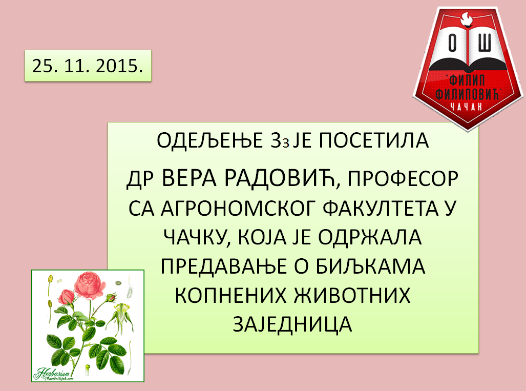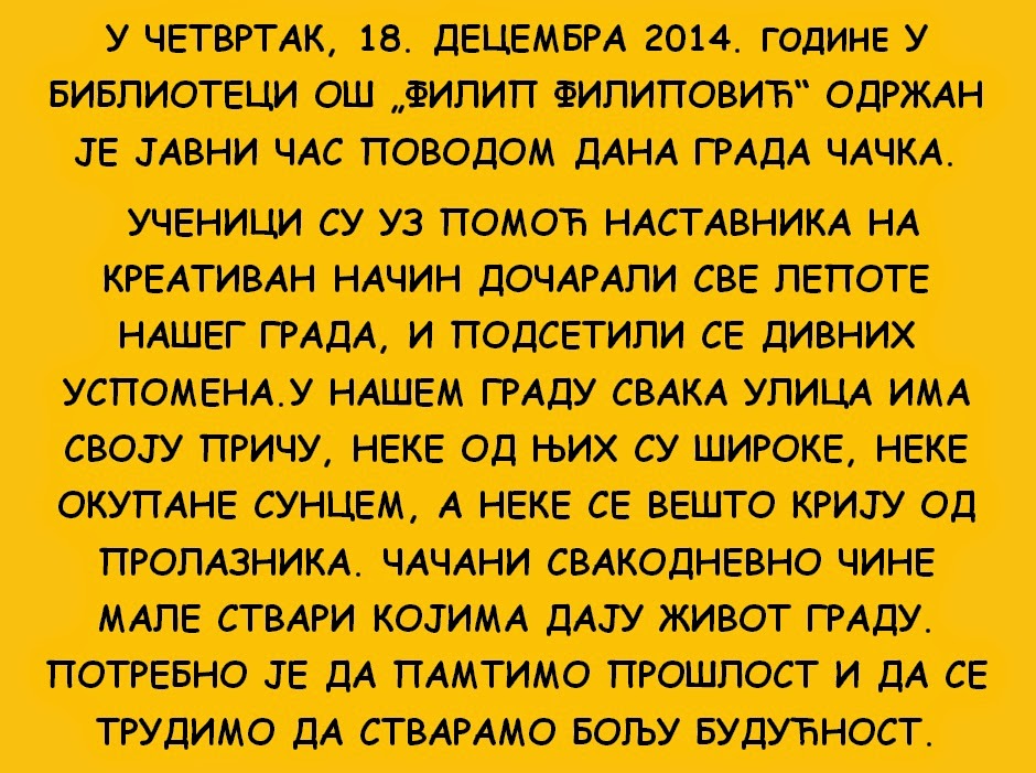 У четвртак, 28. новембра у Основној школи „Филип Филиповић“ представљен је роман наше некадашње ученице, сада професора књижевности у Медицинскиј школи у Чачку. Позни јесењи дани јесу право време за читање и књижевно дружење.То се потврдило и те новембарске вечери када су нашу велику канцеларију испунили љубитељи књиге и Јеленини пријатељи и колеге. Програм је водила Оливера Лабудовић, професор српског језика у нашој школи, Јеленин разредни старешина што је овом сусрету дало посебну драж. Било је дирљиво чути искрене и топле речи којима је Јелена Драмићанин наградила не само своју омиљену професорку и разредну, већ и све нас, њене колеге и саборце за лепу писану реч.