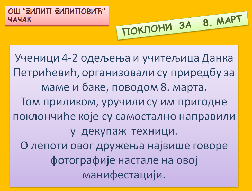 У уторак, 26. 2. 2013. у ОШ ''Филип Филиповић'', одржано је поетско вече Десанки у част''Чуј, рећи ћу ти своју тајну''