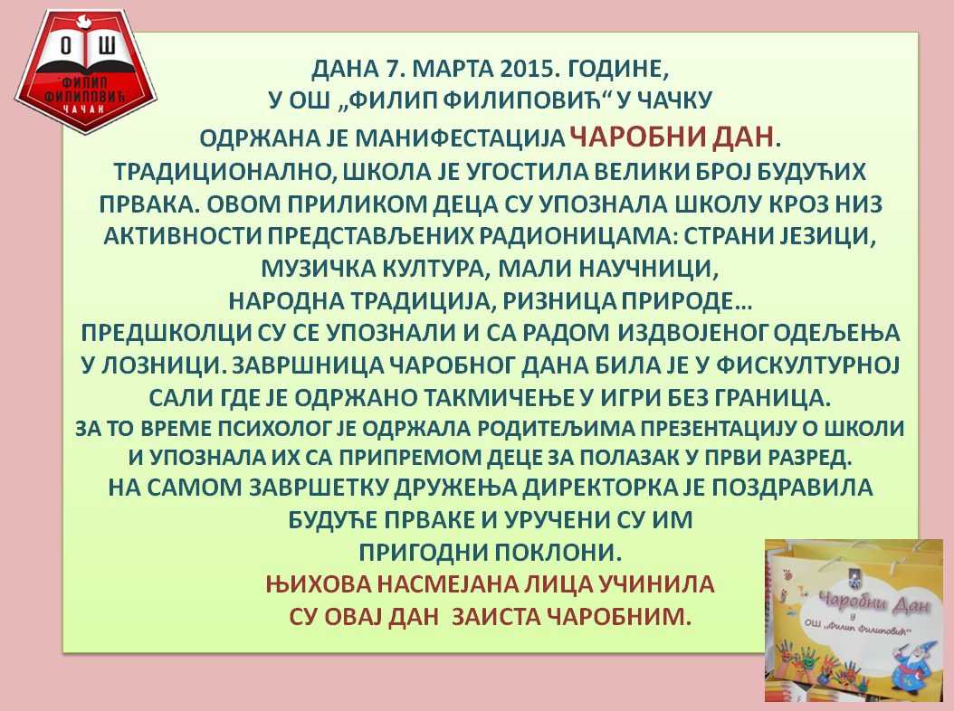 У суботу, 15. 3. 2013. године у нашој школи одржан је ''Чаробни дан'' за све предшколце са територије града Чачка.