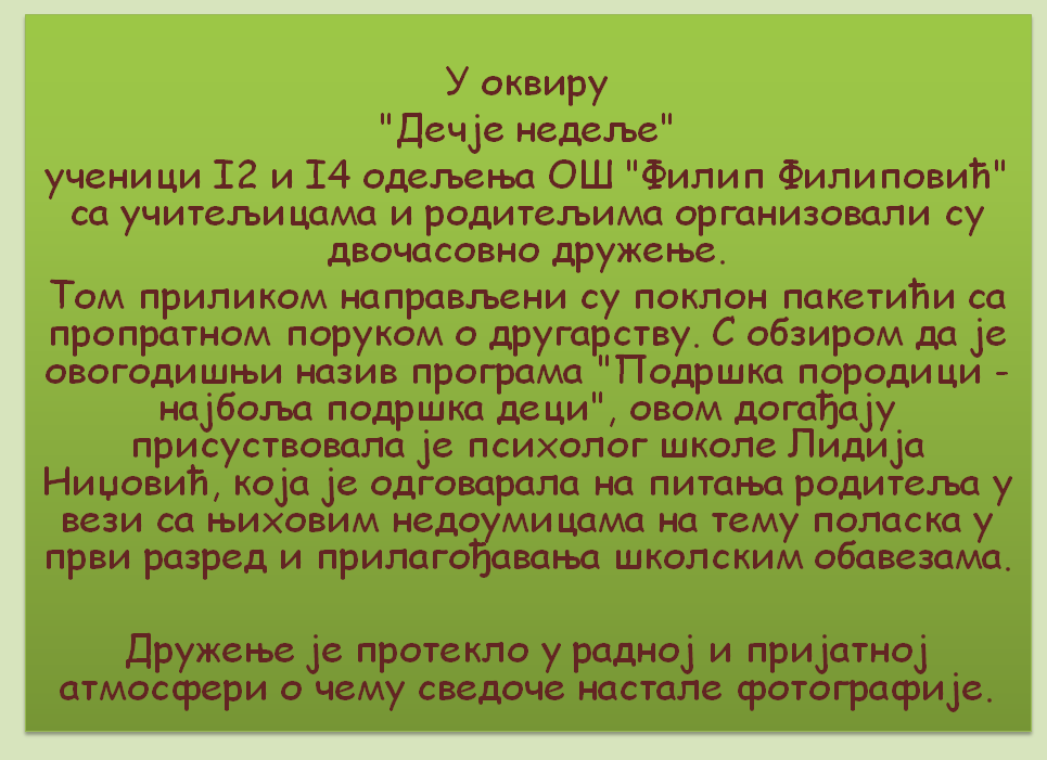 Другог дана обележавања Дечје недеље, ученици 4. разреда и њихове учитељице организовали су дружење са предшколцима из ПУ ''Моје детињство'' - ''Мали капетан''.