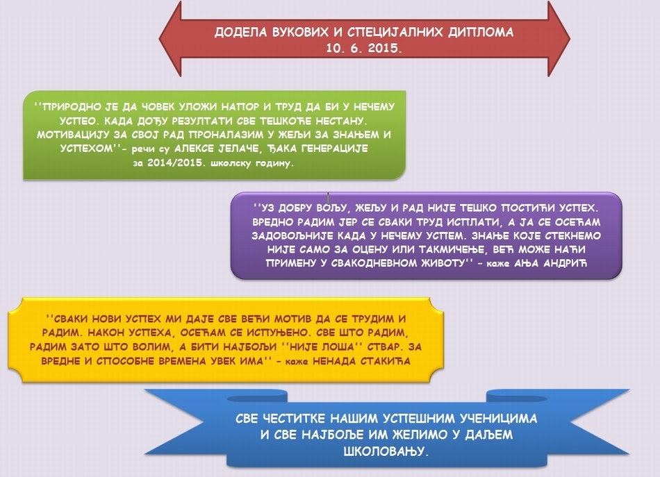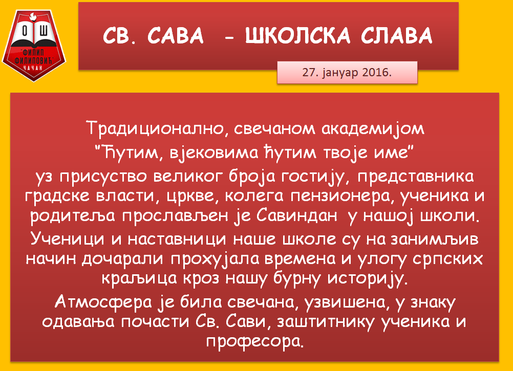 За школску славу, ученици су извели приредбу уз рецитал, хор и фолклор, и тиме су показали свој изванредан таленат. Достојанствено, свечано и отмено приредили су професорима и ученицима своје школе пријатно уживање и указали част и поштовање Светом Сави.